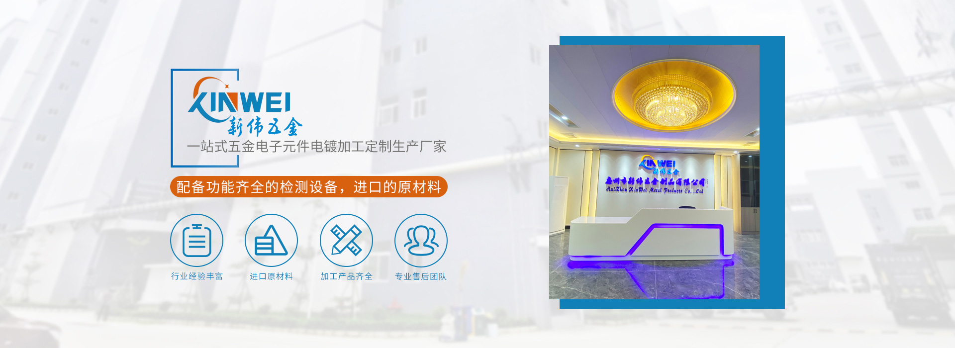 惠州市新偉五金制品有限公司(簡稱:新偉五金)坐落于中國廣東省惠州市,成立于2010年,是一家專業電鍍各種高品質功能性的環保五金電子元件供應商,公司已通過ISO9001:2015及IATF16949:2016質量體系認證。客戶至上,品質至上,承蒙新老客戶的信賴,公司發展迅速,廠房車間面積10000平方米,現有員工200名,并擁有一批從事電鍍行業10年以上、經驗豐富的技術骨干,為客戶解決許多疑難問題,另有一支品質工程小組,專業檢測產品品質,杜絕不良品外流,深受客戶好評。